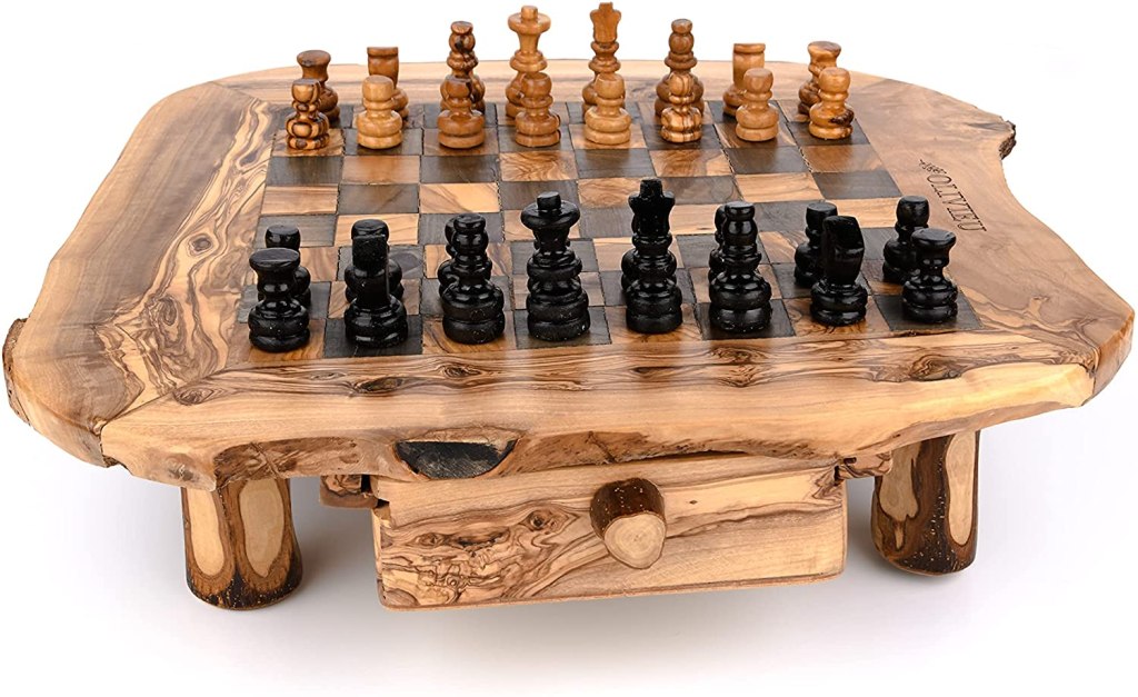 This handmade wooden chess set comes with hand-carved olive wood chess pieces and quirky wooden draws to hold the chess pieces.